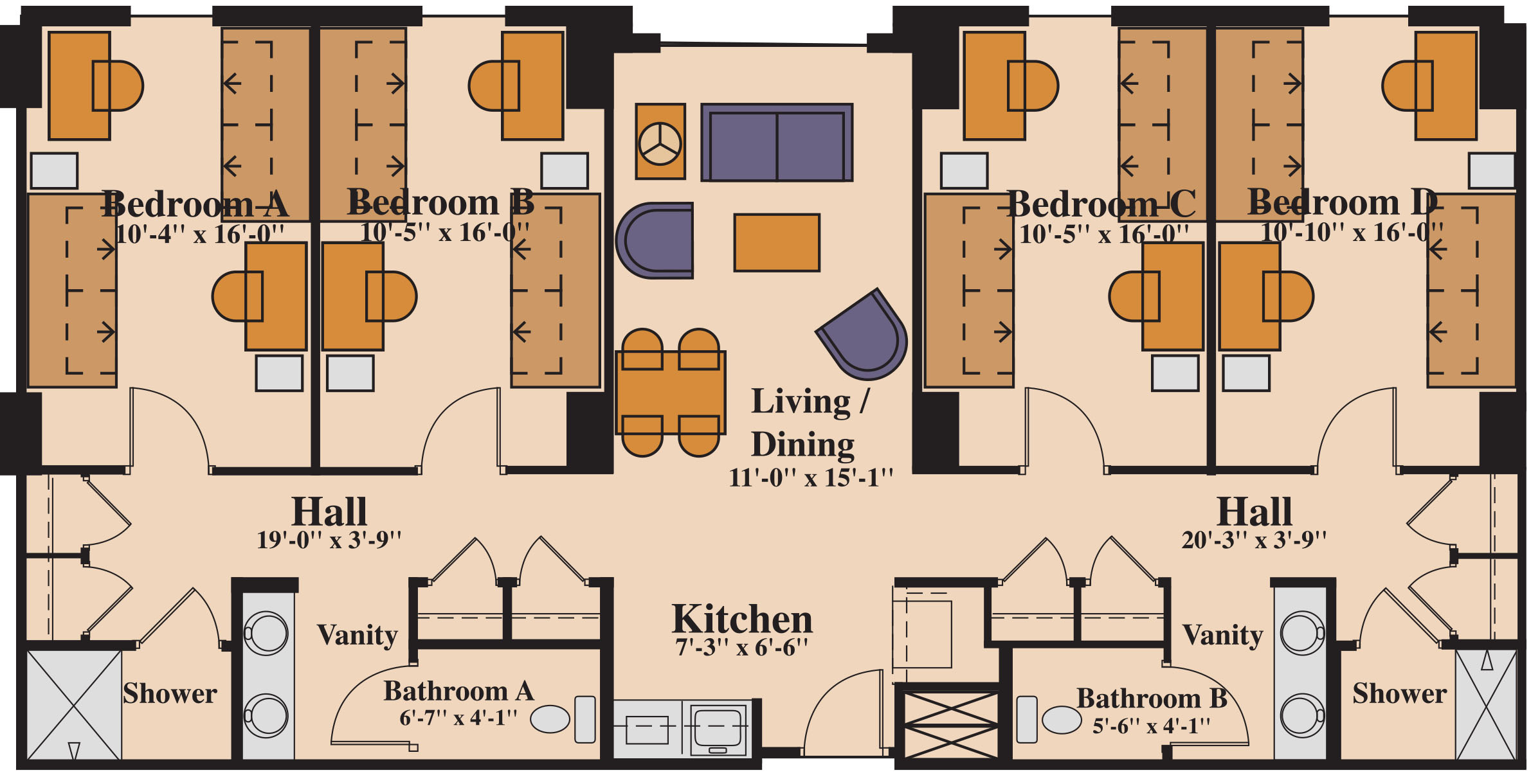 Double occupancy suites in Campus Village Building C include four bedrooms, two bathrooms, a shared living area, and a kitchenette with a microwave. Double occupancy rooms have one set of twin, extra long beds, which can either be bunked or separated. Please note that beds are not furnished with pillows, blanket, or other linen.