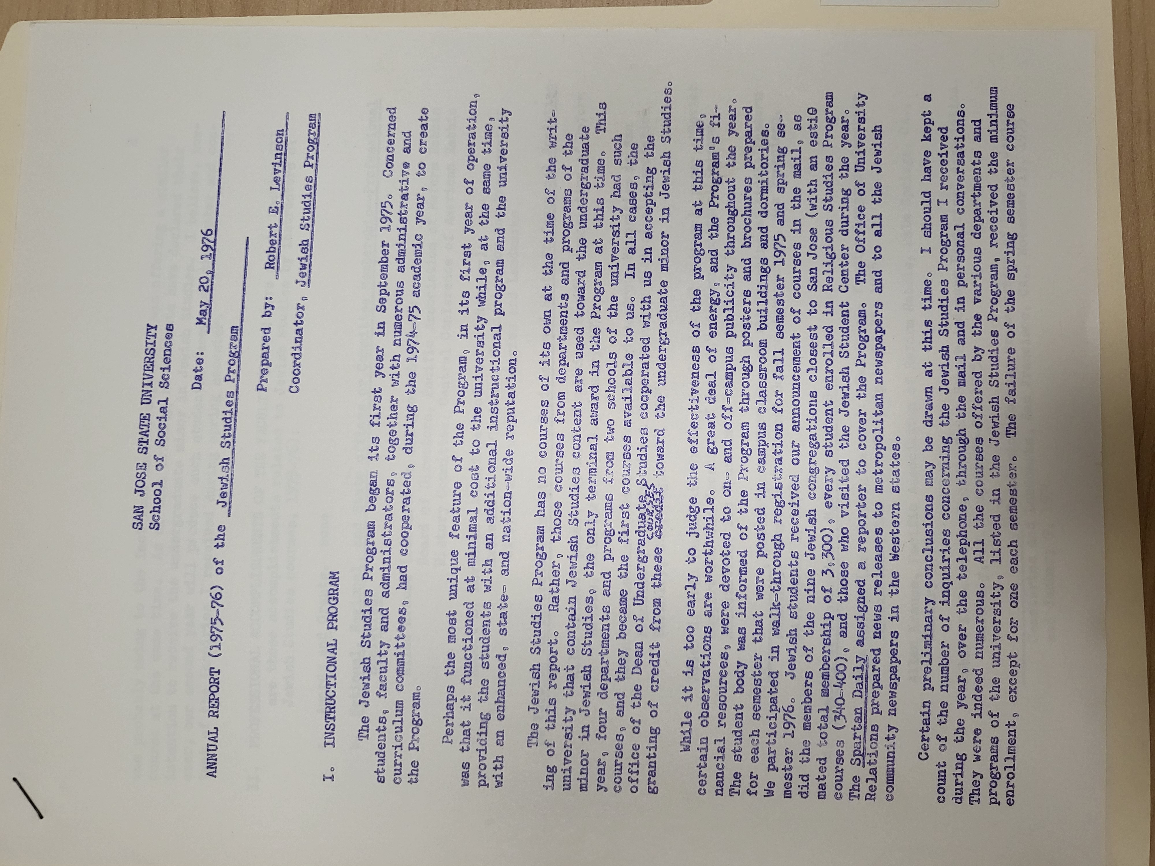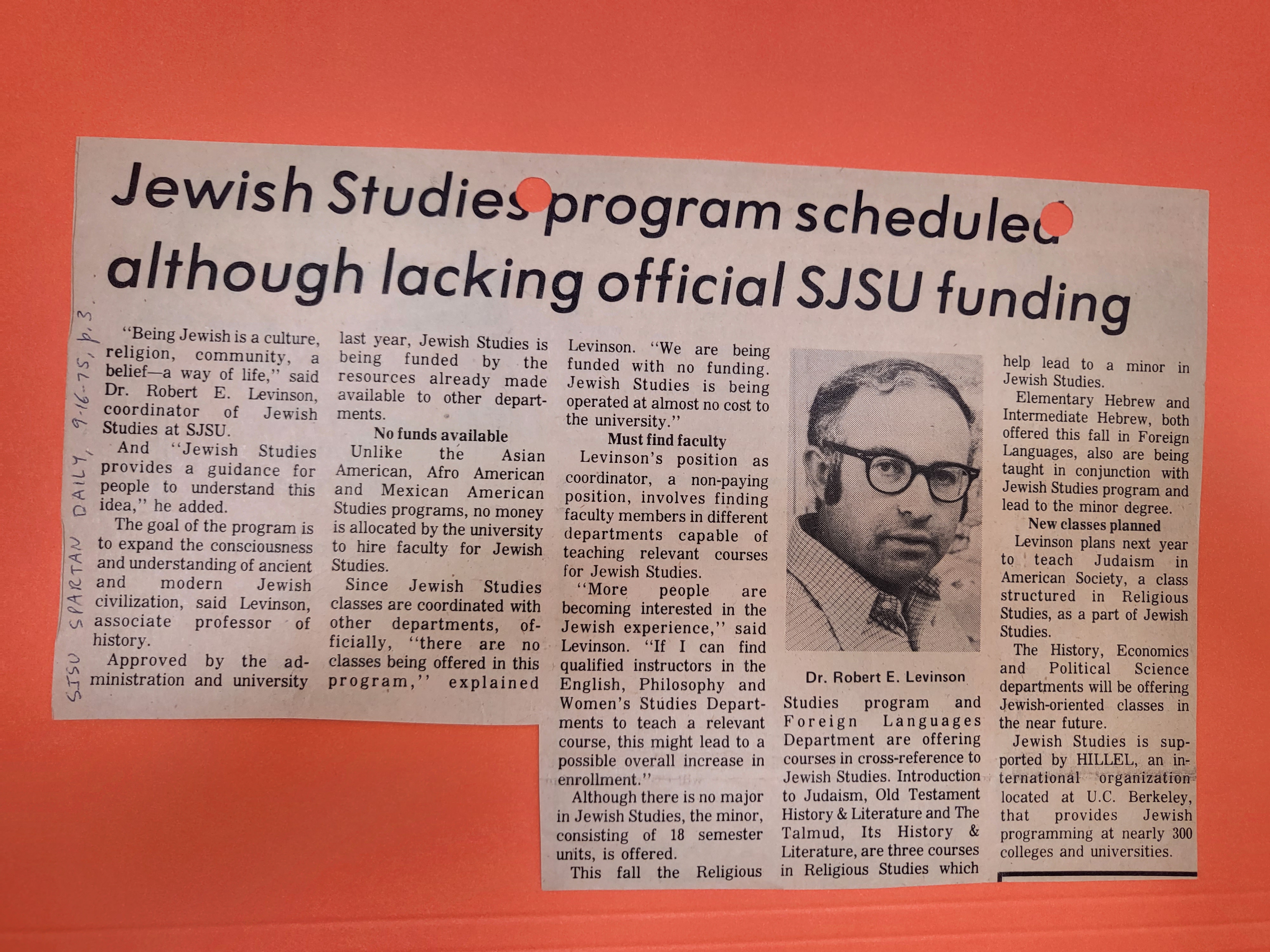 Historian Dr. Robert Levinson founded the SJSU Jewish Studies program as an assistant professor here in 1974-75. From the beginning, he assembled an interdisciplinary program, bringing together the departments of History, Religion, and Hebrew. Early on, he added Geography, Philosophy and English to the mix. As a lay cantor for a local synagogue, Congregation Beth David, Professor Levinson also always understood Jewish education as life-long learning. Thus, community members were welcome in all classes. Interested in further history? You might enjoy this 1975 Spartan Daily piece on Bob Levinson and the JS Program. Or this annual report from 1976 (notice how much work they did to publicize the program, before the days of the internet!)
