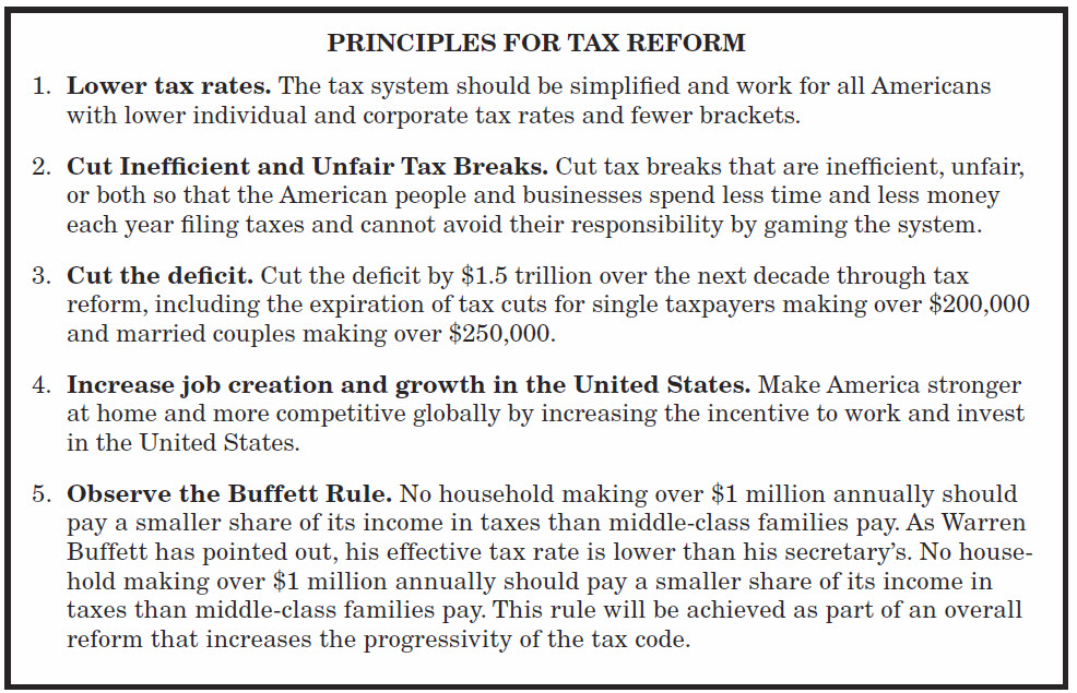 September 2011 - Office of Management and Budget, Living Within Our Means and Investing in the Future - The President’s Plan for Economic Growth and Deficit Reduction, Sept. 2011. This report lays out a plan to pay for President Obama’s proposed American Jobs Act and allowing for net deficit reduction of $3 trillion over ten years which he hoped the Joint Select Committee on Deficit Reduction would incorporate into their proposal for how to reduce the deficit. President Obama’s American Jobs Act proposal, a 199 page proposal, included tax changes noted in this column. The report also includes President Obama’s five principles of tax reform (see below).